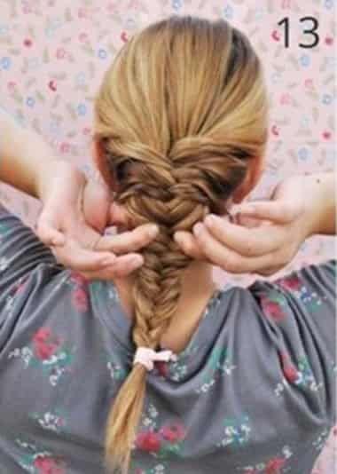 3. 编织:将这束头发从右侧穿过左侧头发,然后从下方穿过,形成一个小辫子。